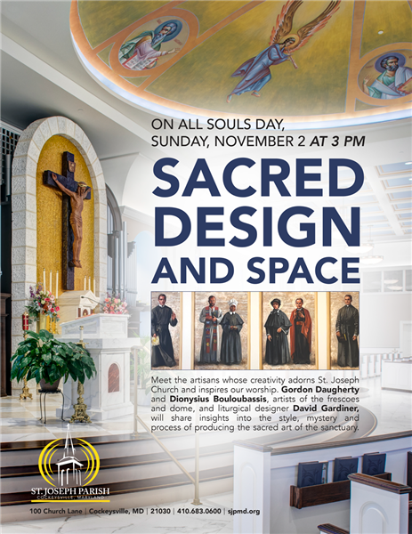 SACRED DESIGN AND SPACE on All Souls Day, Sunday, November 2 at 3pm Meet the artisans whose creativity adorns St. Joseph Church and inspires our worship. Gordon Daugherty and Dionysius Bouloubassis, artists of the frescoes and dome, and liturgical designer David Gardiner, will share insights into the style, mystery and process of producing the sacred art of the sanctuary.