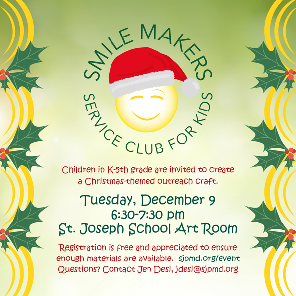 Smile Makers returns for Advent! Register below for the St. Joseph craft service club for children in grades K–5. The December meeting will take place on Tuesday, December 9, from 6:30 to 7:30 pm in the school art room. Parents may stay or drop children off. Questions? Email Jen Desi at jdesi@sjpmd.org.
