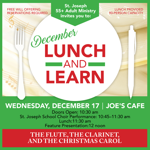 A Christmas Carol Lunch and Learn Join us for a special Lunch and Learn that is sure to get you in the holiday spirit! Event Schedule Doors Open: 10:30 am St. Joseph School Choir Performance: 10:45 am – 11:30 am Lunch: 11:30 am Feature Presentation: 12:00 pm The Flute, the Clarinet, and the Christmas Carol